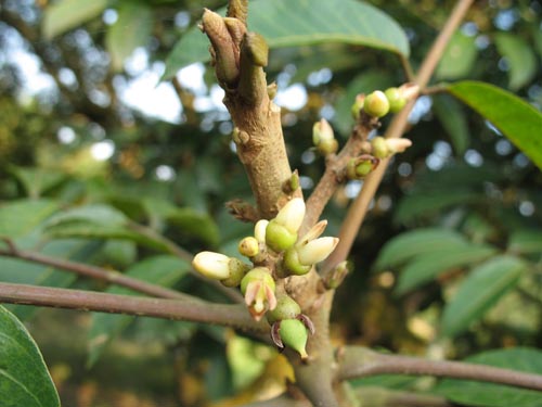 一般橄榄的开花、结果期都在5月初到6月初,时间约一个月。先开花,先结果,此时,果穗上的果实大小不一,但随着养分的积累,果实才逐渐趋向大小均衡。如果树体的营养不良,则果实的大小不一。 一般情况下,当地的橄榄很少到6月底才开花的,这是不正常的现象,此时开花,也能结果,但由于处在高温季节,加上养分的消耗量大,所以结的果比较小,畸形果也比较多。 调查中发现,出现此类现象的主要是“不知春”的橄榄树,在没有抽春梢的情况下直接抽花穗,并开花结果,但其座果率不稳定,果实品质比较差。要避免此类情况的发生,就必须防止橄榄的“不知春”,在“春分”尚未抽新梢,就必须采取措施促其萌动。 图:6月底开的橄榄花(无春梢)
